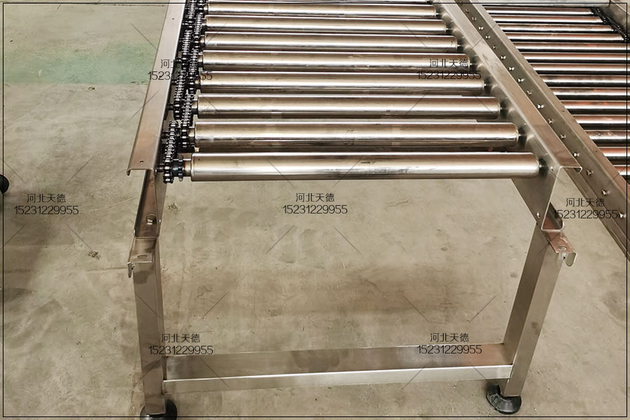 飲料輸送線滾筒輸送機傳動方法:多肽鏈輪、發夾結構輪、O型傳動帶、平面磨擦皮帶、同步皮帶、多楔帶等。